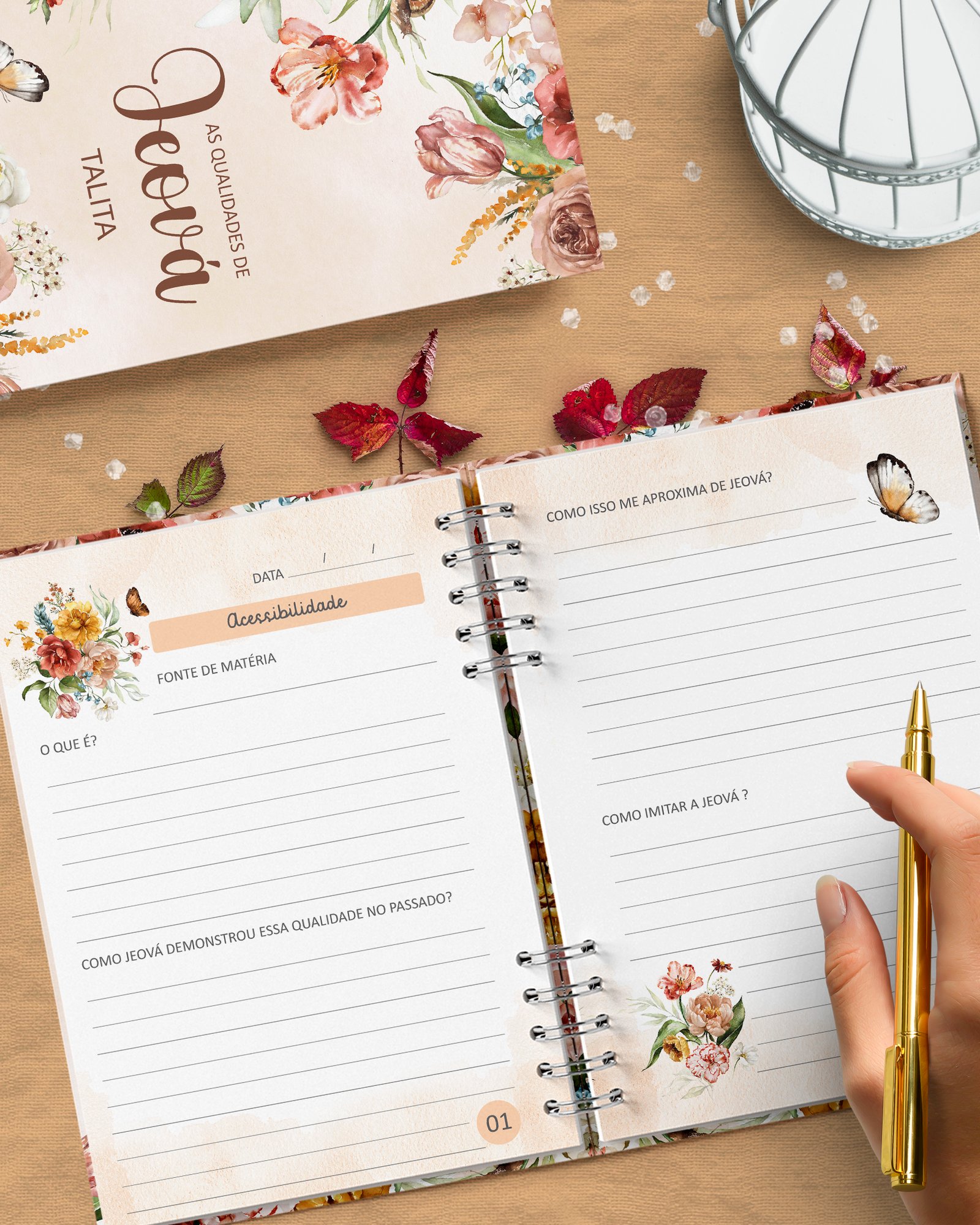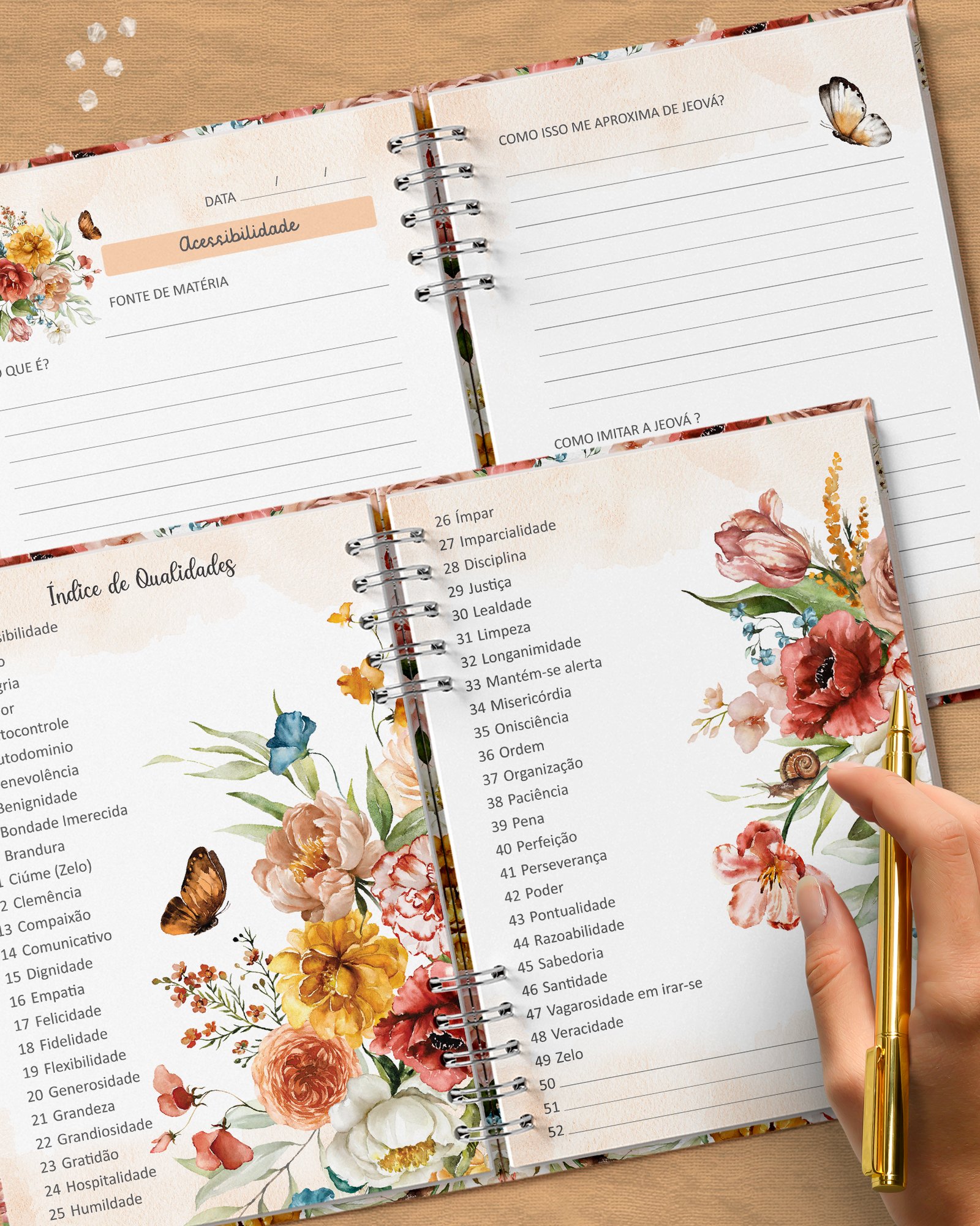 O destaque deste caderno é o índice dedicado às Qualidades de Jeová. As páginas estão numeradas para corresponder diretamente ao índice, permitindo uma navegação simplificada e organizada. Nunca foi tão fácil dedicar seu tempo ao estudo de temas espirituais, com cada qualidade disponível em uma estrutura acessível e visualmente clara.
